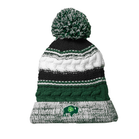 BuffaLove Irish Knit Pom Hat - multi colored green and white. Embroidered BuffaLove Irish Logo