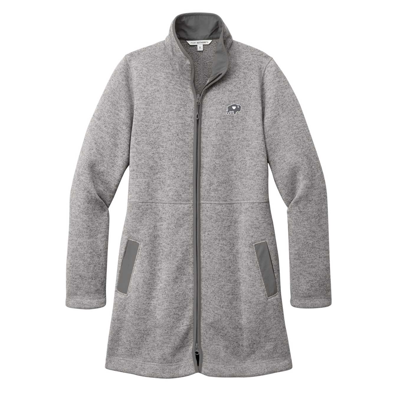 Embrace your Buffalo pride with the Ladies Arc Sweater Fleece Long Jacket from Buffalove. This heathered pattern jacket is crafted from 100% polyester, ensuring warmth and comfort in every season. Designed as a fleece sweater, it works well with other layers, making it a versatile addition to your wardrobe. Open hand pockets add convenience and style, perfect for keeping your essentials close. Share your Buffalo spirit and stay cozy with this elegant and functional piece.