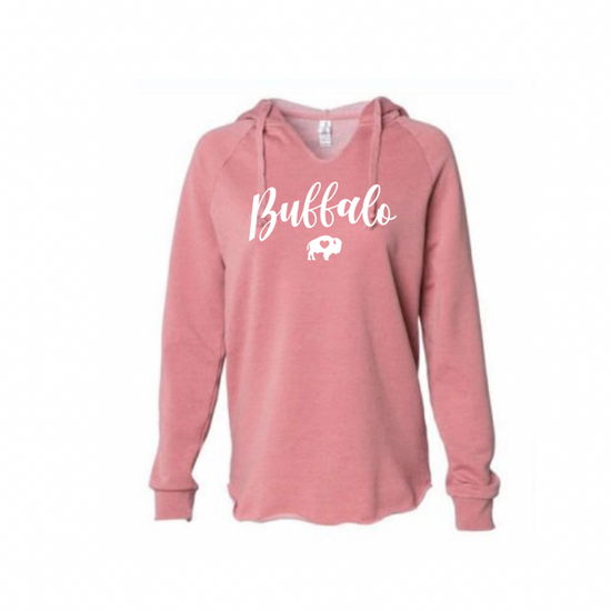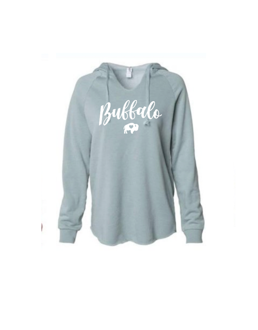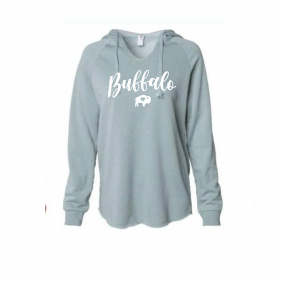 Our Ladies V-Neck Hoodies come in Sage and Mauve are printed with the word Buffalo in cursive in White Ink!