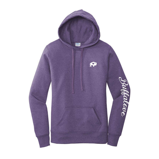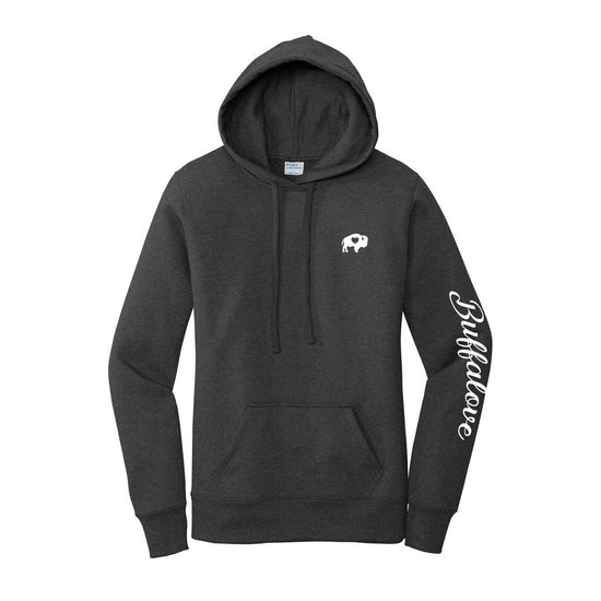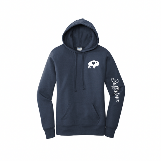 Our Ladies Traditional Hoodie comes in Navy, it has our small Buffalo on the left chest and the word BuffaLove in cursive down the arm.
