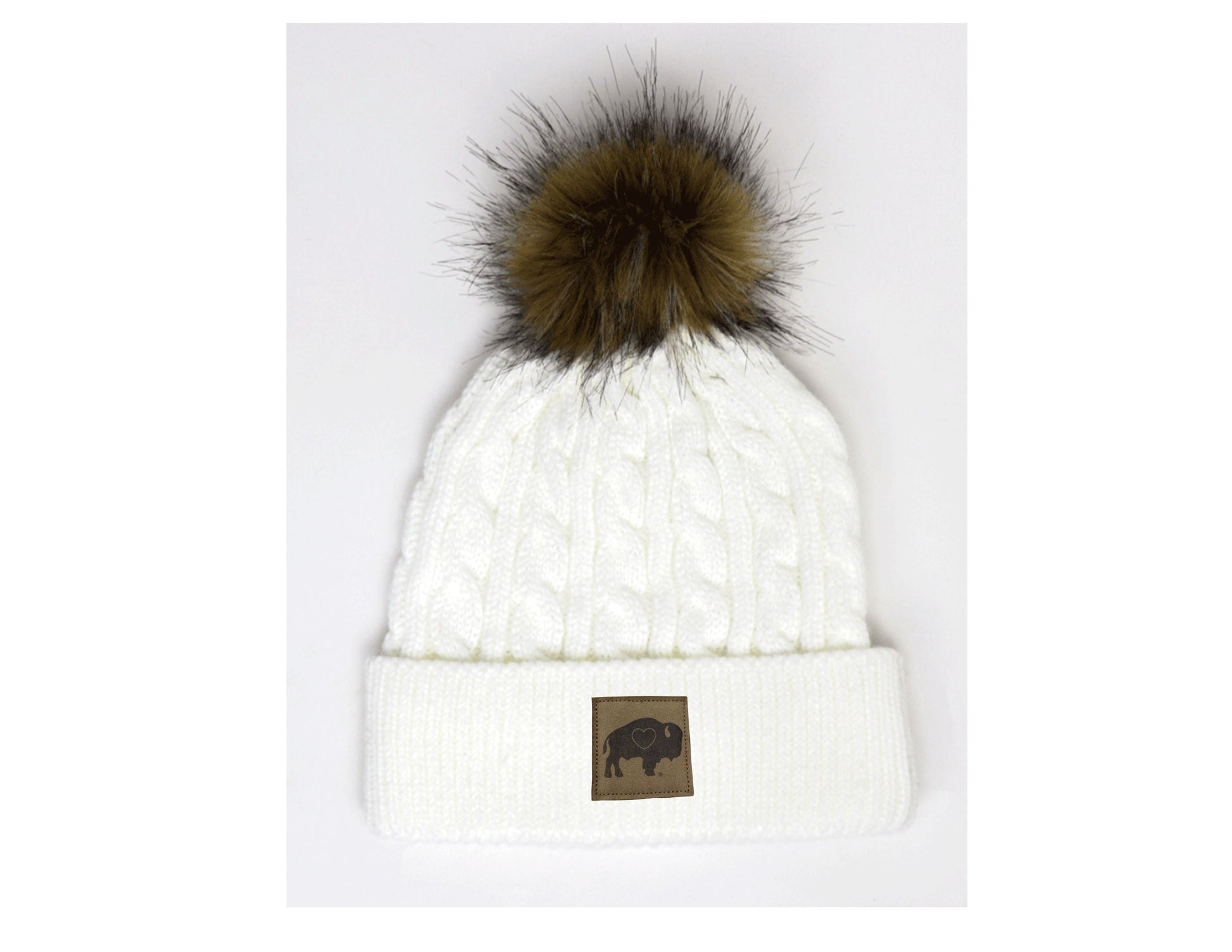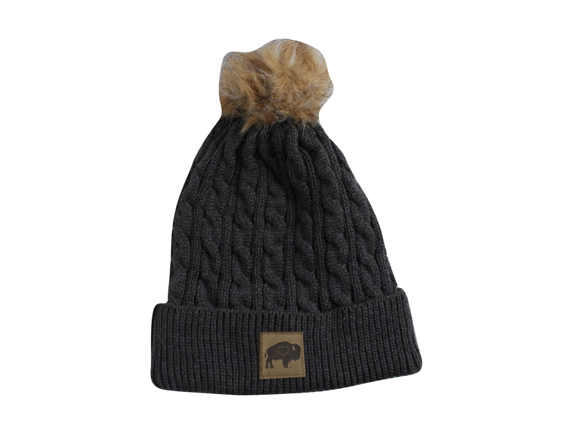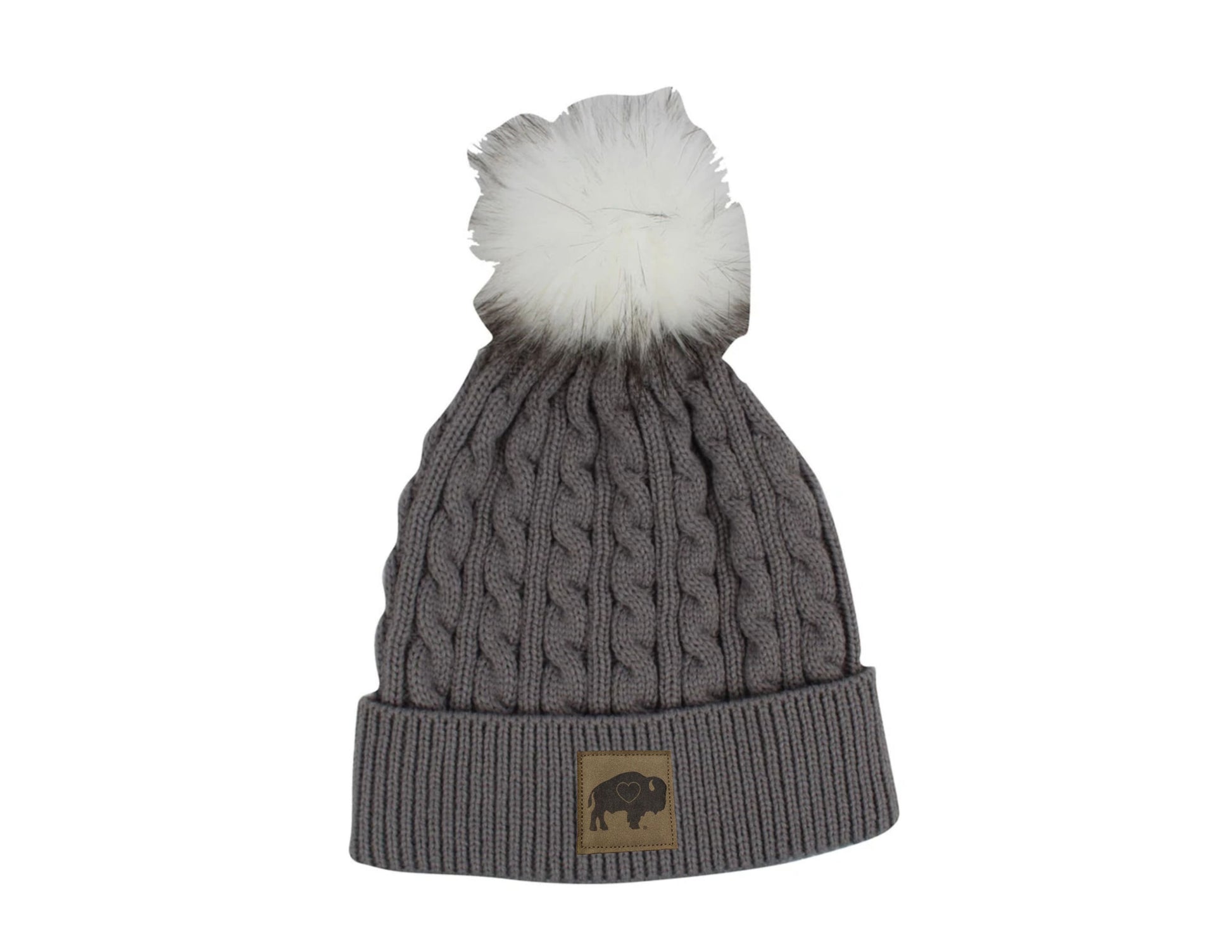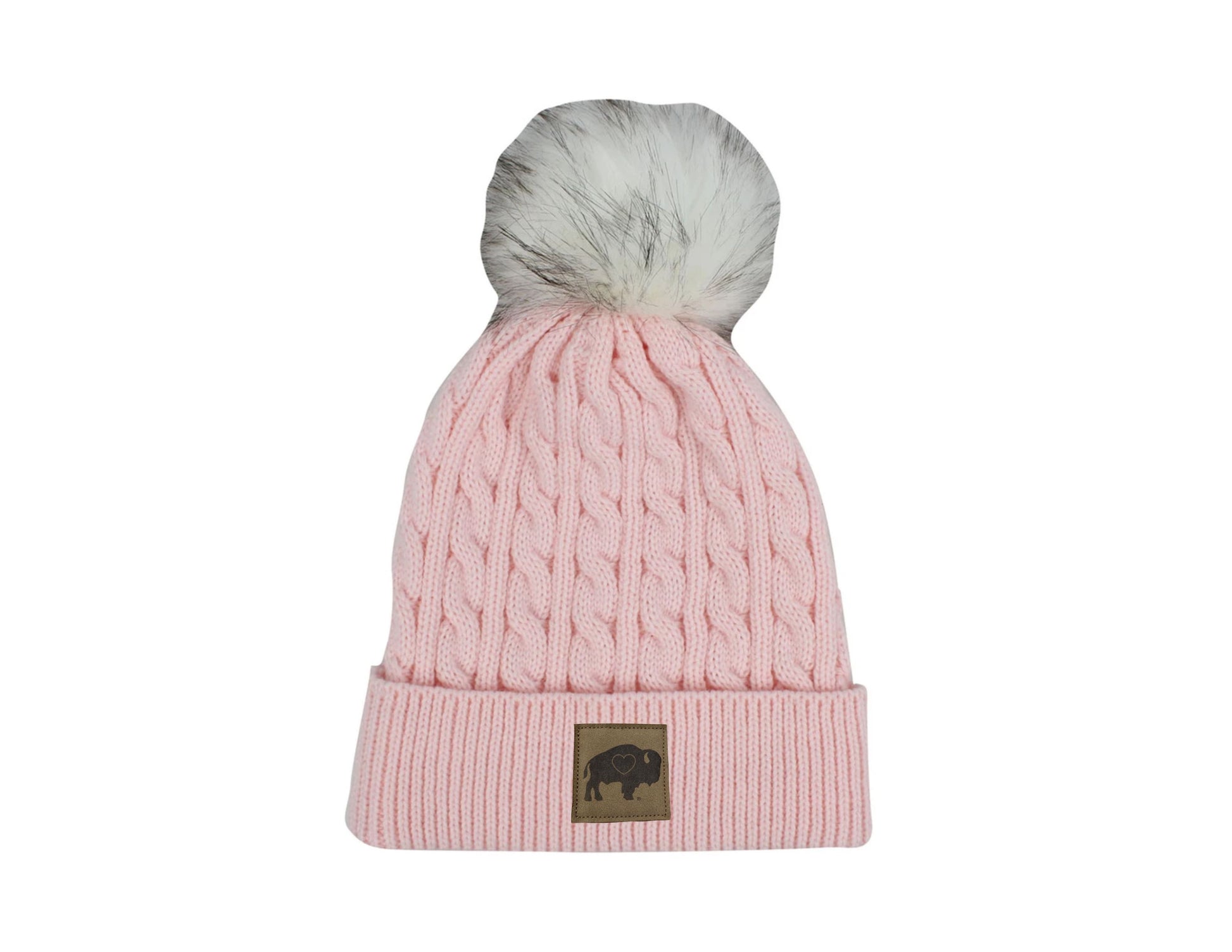 Our Pom Hats with a Leather Patch come in Charcoal Grey, Light Grey, White and Pink.